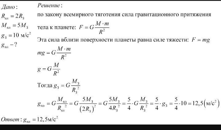 Радиус некоторой планеты в 2 раза больше радиуса Земли, а ее масса больше в 5 раз , чем у Земли. Определите ускорение свободного падения на поверхности этой планеты. Ускорение свободного падения на поверхности Земли 10м/с2.