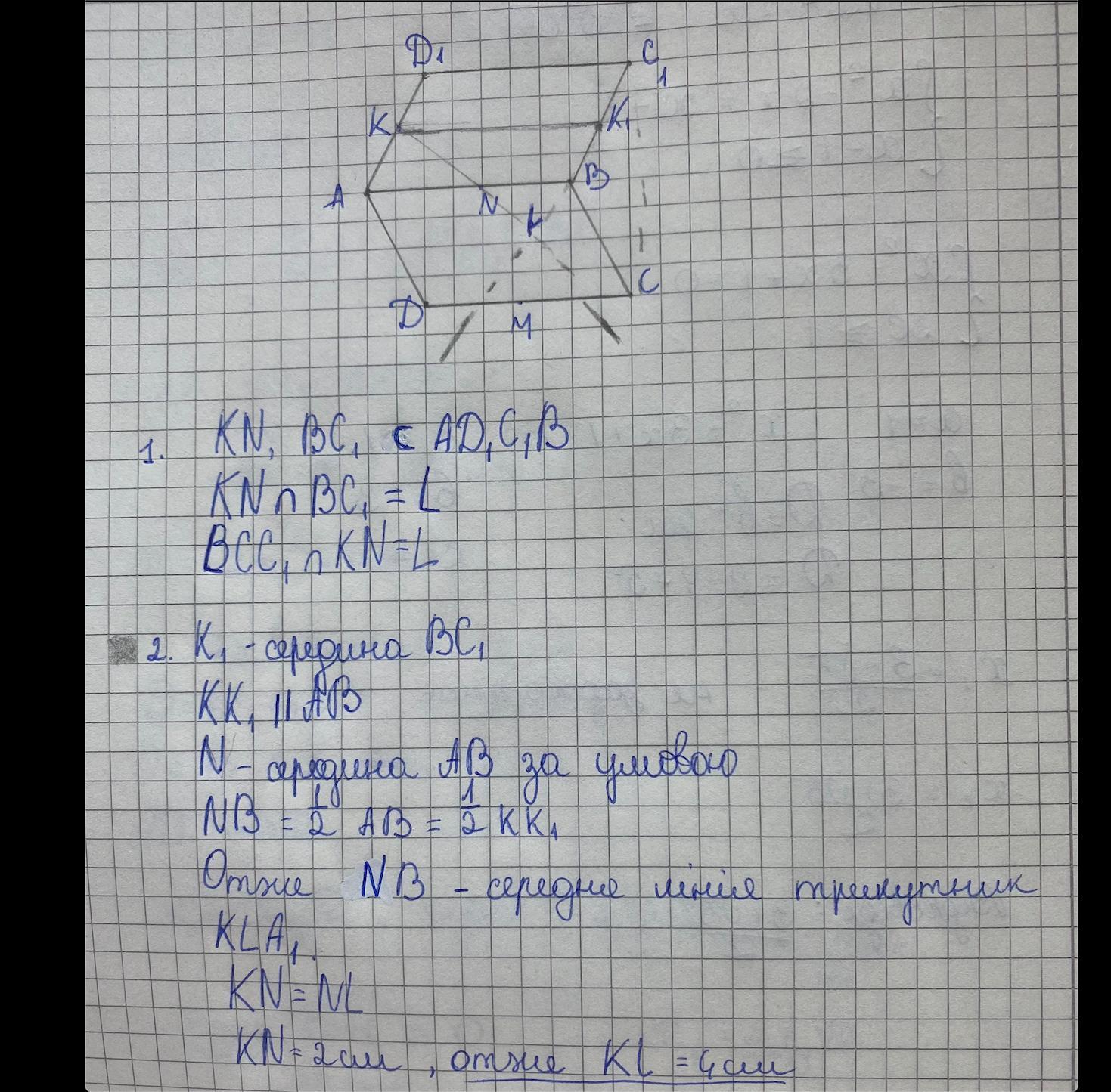 Два паралелограми АВСD i АВС1D1 лежать у різних площинах, N, M i K — середини сторін АВ, CD i АD1 вiдповiдно. Побудувати точку перетину L прямої KN з площиною ВСС1. Обчислити довжину вiдрiзка KL, якщо KN дорівнює 2 см