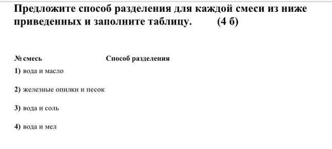 3.На уроке химии ученику были выданы 4 смеси. Предложите способ разделения для каждой смеси из ниже приведенных и заполните таблицу.