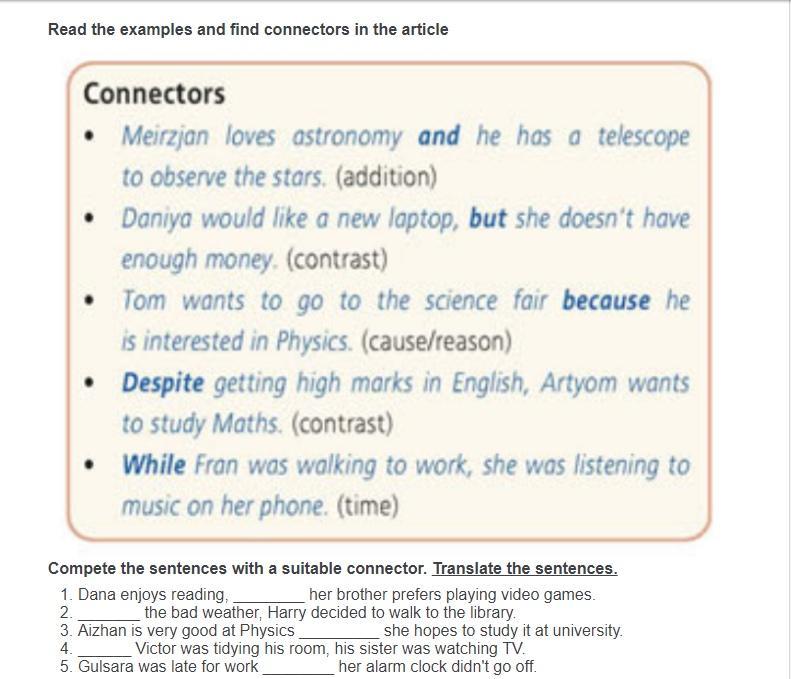 Помогите! Compete the sentences with a suitable connector. Translate the sentences.