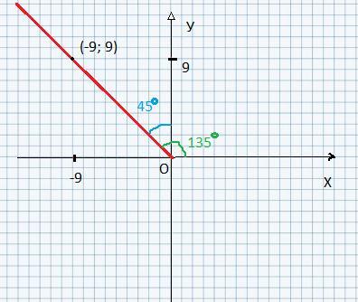Так как точка с координатами (-9; 9) находится на одинаковом расстоянии от оси х и от оси у, то она образует угол в 45° с полуосью Оу и 90° + 45° = 135° с осью Ох