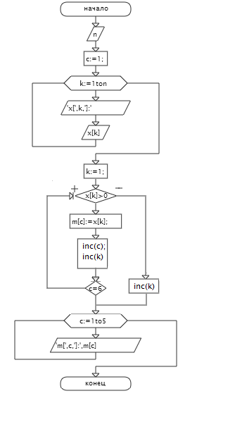 Дан массив X(N)(N<=40) записать в массив М подряд пять первых положительных элементов массива Х, массив М расспечатать, пожалуйста сделайте блок съхему