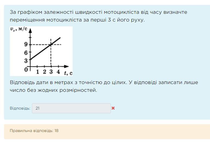 За графіком залежності швидкості мотоцикліста від часу визначте переміщення мотоцикліста за перші 3 с його руху.