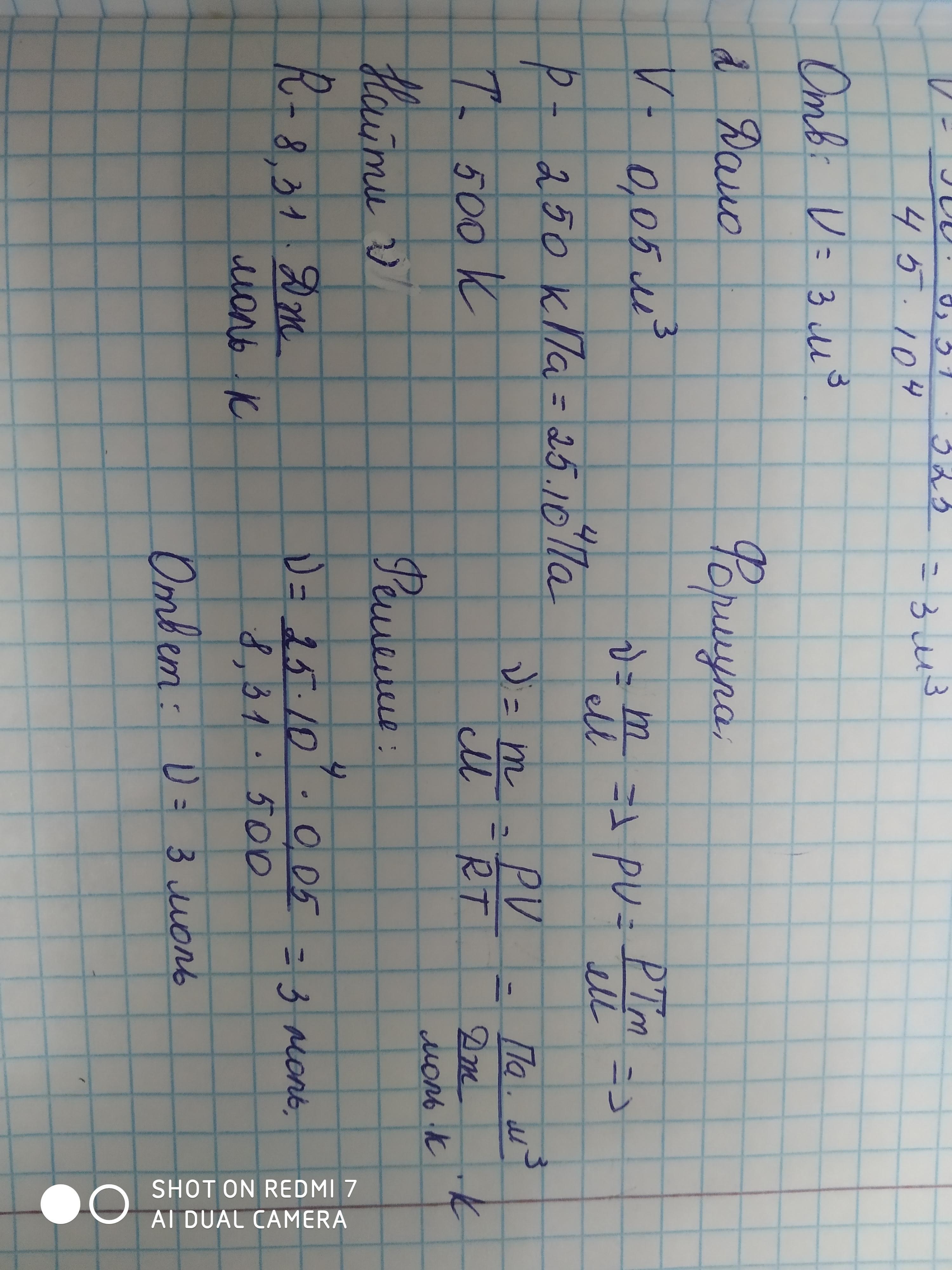 давление газа объемом 0,05м3 составляет 250 кпа а температура 500к.определите количество вещества.