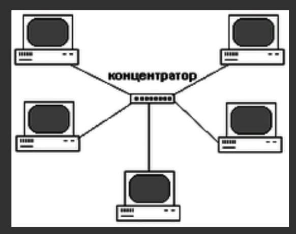 Звезда топология в которой все компьютеры сети присоединены к центральному узлу (обычно коммутатор), образуя физический сегмент сети.