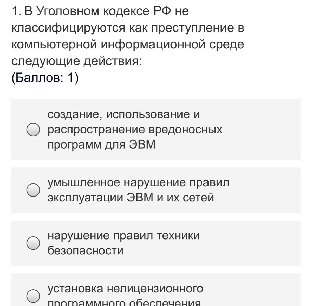 В Уголовном кодексе РФ НЕ классифицируется как преступление в компьютерной информационной среде следующие действия: установка нелицензионного программного обеспечения; создание, использование и распространение вредоносных программ для ЭВМ; умышленное нарушение правил эксплуатации ЭВМ и их сетей; нарушение правил техники безопасности.