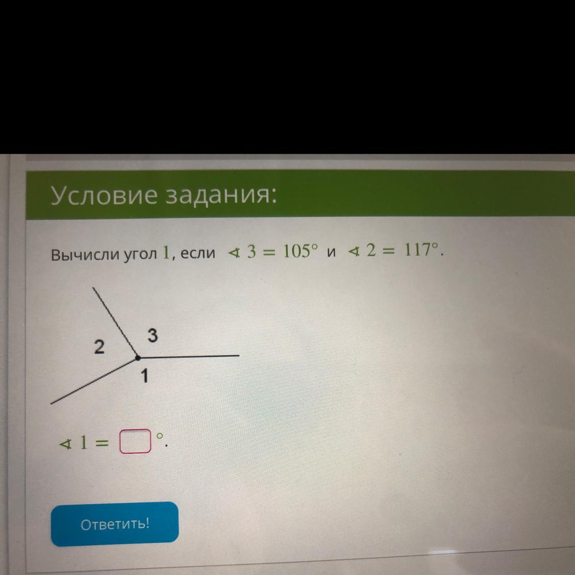 Вычисли угол 1 если угол 3 = 105 градусов и угол 2 = 117 градусов.