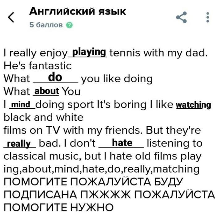 films on TV with my friends. But they're _____ bad. I don't _______ listening to classical music, but l hate old films playing,about,mind,hate,do,really,matching ПОМОГИТЕ ПОЖАЛУЙСТА БУДУ ПОДПИСАНА ПЖЖЖЖ ПОЖАЛУЙСТА ПОМОГИТЕ НУЖНО