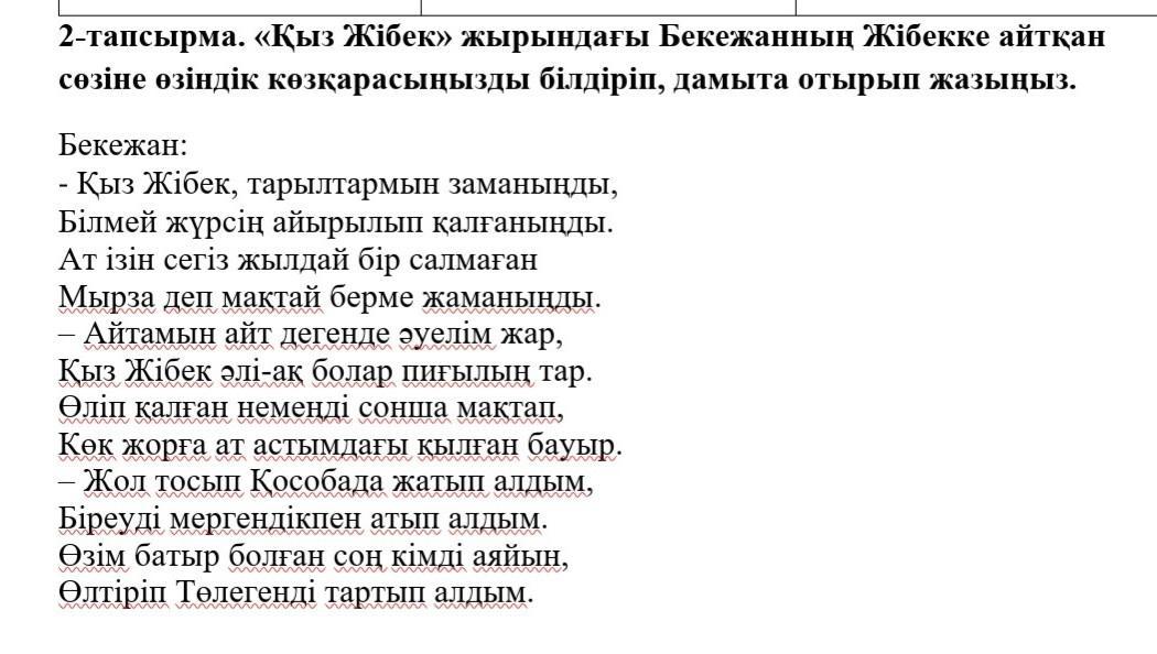 «Қыз Жібек» жырындағы Бекежанның Жібекке айтқан сөзіне өзіндік көзқарасыңызды білдіріп, дамыта отырып жазыңыз.