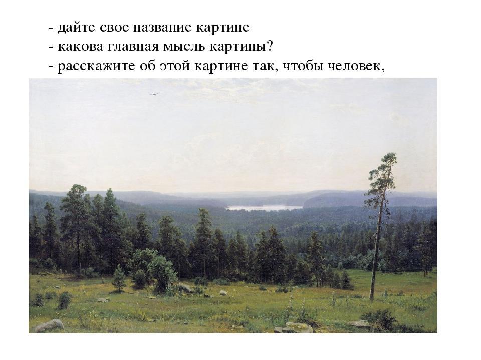 - дайте свое название картине - какова главная мысль картины? - расскажите об этой картине так, чтобы человек, который ее не знает, мог составить о ней представление?