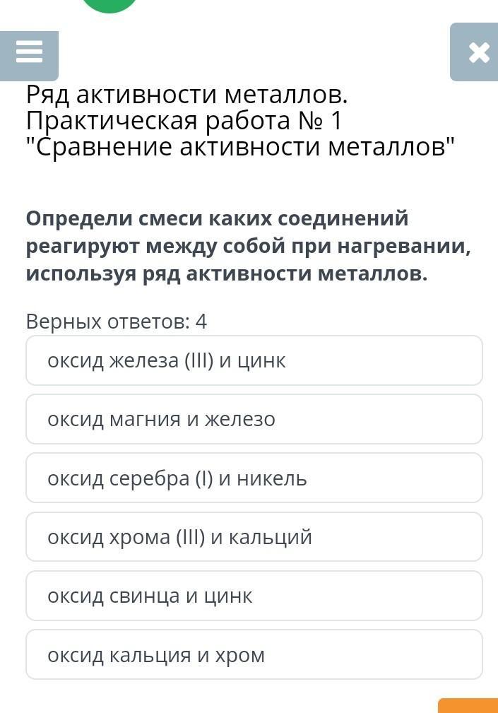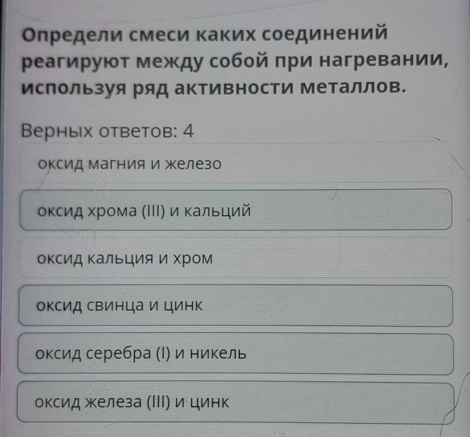 Определи смеси каких соединений реагируют между собой при нагревании, используя ряд активности металлов.