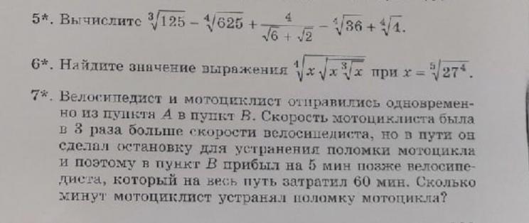 7) Так как скорость мотоциклиста в 3 раза больше, чем скорость велосипедиста, то если бы мотоциклист не делал остановку, то он приехал бы в пункт В за 60:3=20 мин.