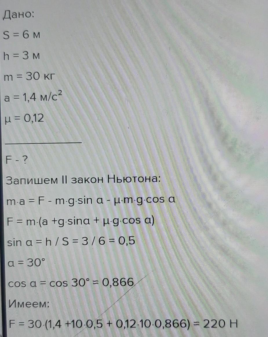 98. На наклонной плоскости длиной 5 м и высотой 3 м лежит груз массой 26 кг. Коэффициент трения равен 0,4. Какую силу надо приложить к грузу вдоль плоскости, чтобы тащить его вверх по наклонной плоскости с ускорением 0,8 м/с2.
