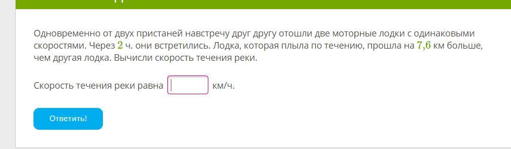 Одновременно от двух пристаней навстречу друг другу отошли две моторные лодки с одинаковыми скоростями. Через 2 ч. они встретились. Лодка, которая плыла по течению, прошла на 7,6 км больше, чем другая лодка. Вычисли скорость течения реки.