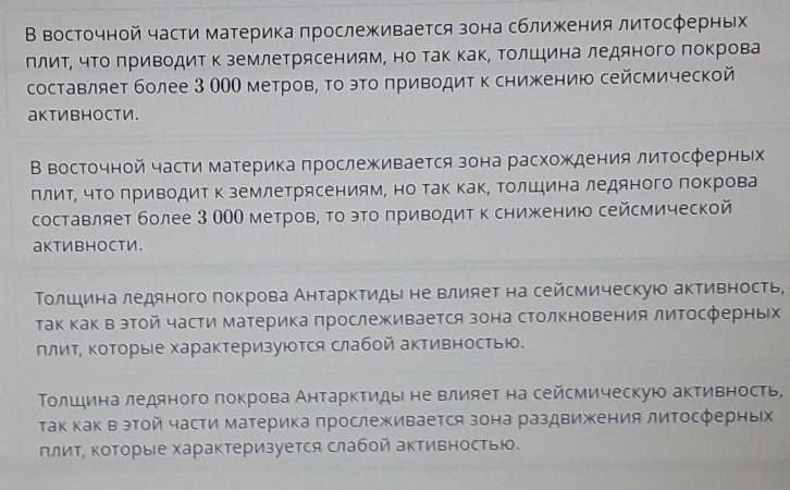 Согласно исследованиям Университета Дрекселя (США) землетрясения на территории восточной части Антарктиды не являются аномальным явлением, но их магнитуда не превышает 4 баллов. Используя карту движения литосферных плит и карту толщины ледникового покрова, объясни слабую сейсмическую активность восточной части Антарктиды.