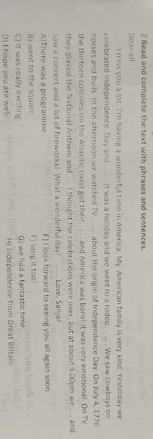 I hope you are well. I miss you a lot. I'm having a wonderful time in America. My American family is very king. Yesterday we celebrated Independence Day and we had a fantastic time. It was a holiday and we went to a rodeo. It was really exciting. We saw cowboys on horses and bulls.In the aftetnoon we watched TV. There was s programme about the origin of Independence Day. On July 4,1776 the therteen colonies on the Atlantic coats hot their independence from Great Britain and America was born! It was very emotional. On TV they played the National Anthem and we sang it too!