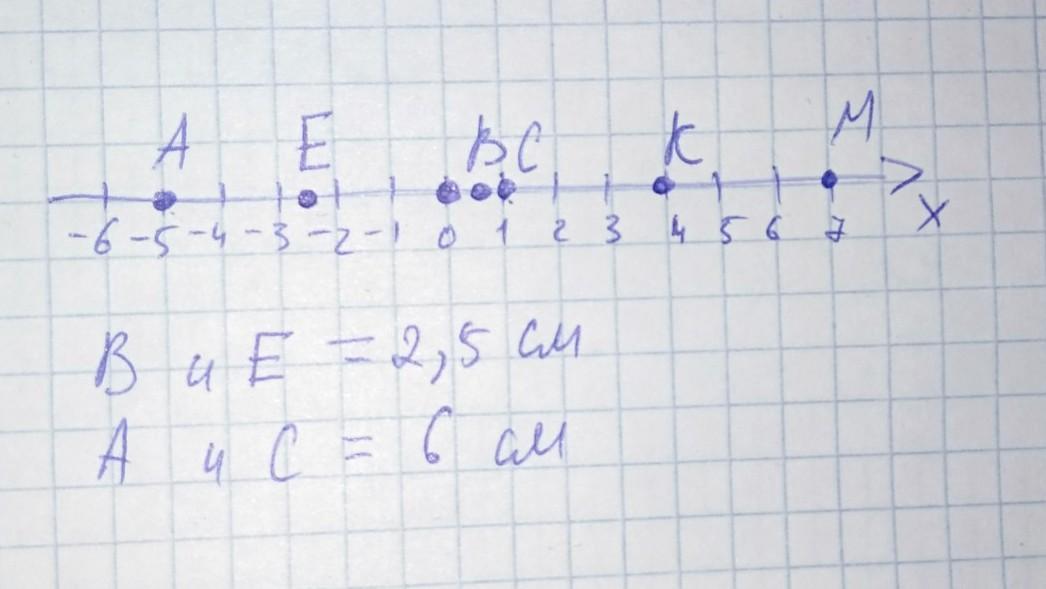 Изобразить на координатной прямой точки А(-5); В(0,5); С(1); E(-2,5); К(4); М(7) и найдите расстояние между точками В и Е, АиС. Помогите кому не жалко