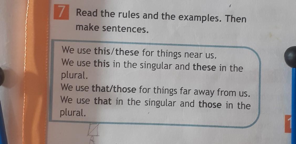 7 Прочтите правила и примеры. Затем составляйте предложения. Мы используем это / это для вещей рядом с нами. Мы используем this в единственном числе, а эти - во множественном. Мы используем это / те для вещей, находящихся далеко от нас. Мы используем это в единственном и множественном числе.