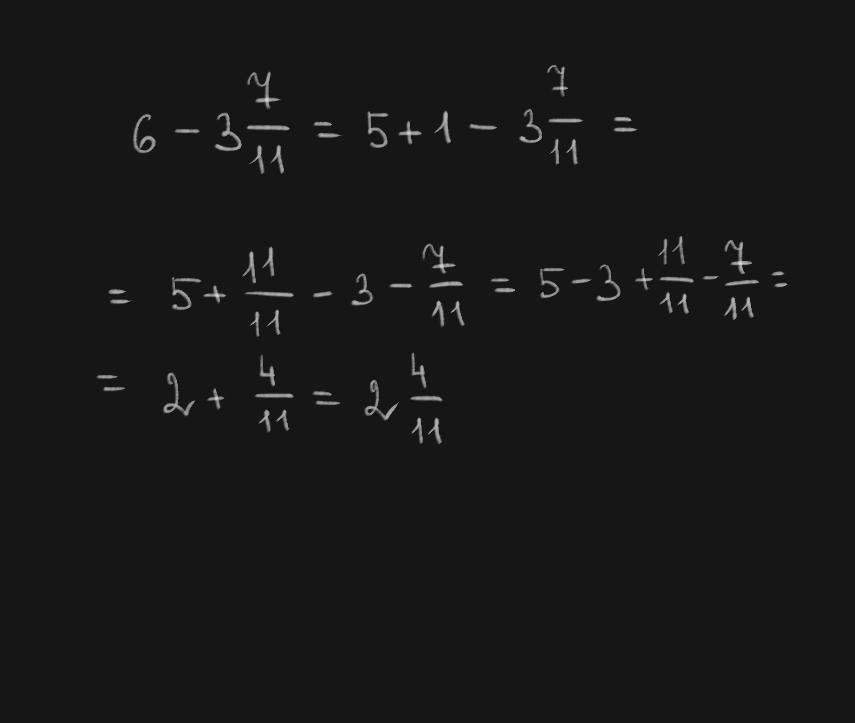 6 - 3 7\11= 5 11\11 - 3 7\11=2 4\11(от целой части отнимаем целую часть,от дробной-дробную)
