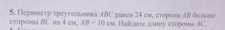 АВ=10, ВС=10-4=6 см (Т.к. АВ больше ВС на 4 см, следовательно нужно вычитать)