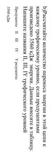 Ответ: При переходе энергии с одного трофического уровня на следующий 90% энергии теряется. То есть переходит всего лишь 10 %. Если продуценты накопили 3560 кДж энергии, то консентам I перейдёт только 356 кДж, к консументам II - 35,6 кДж, консументам III- 3,56 кДж и консументам IV - 0,36 кДж