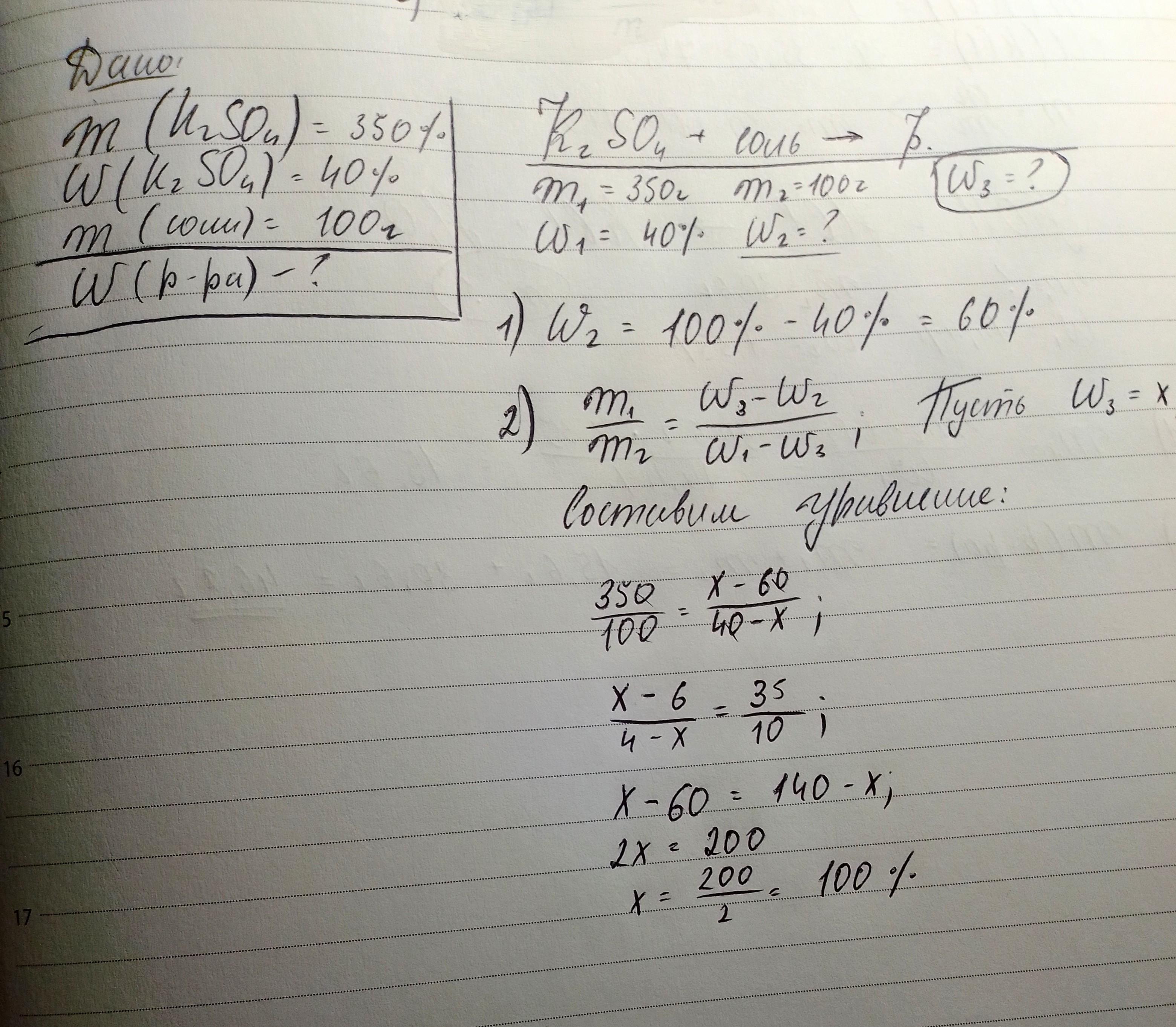 Имеется 350г 40%-го раствора K2SO4. К этому раствору добавили 100г соли. Найдите процентную концентрацию полученного раствора.