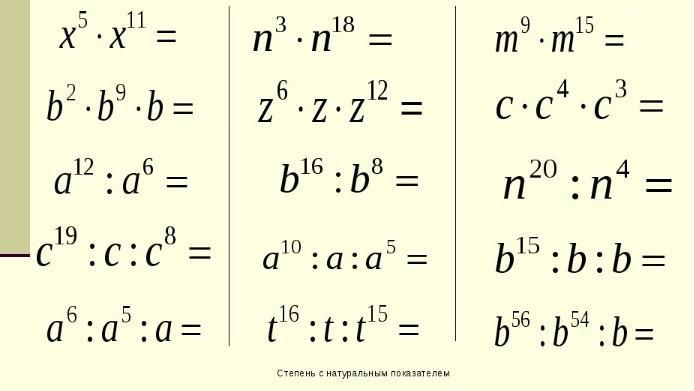 При умножении степени складываются, показатели остаются прежними, при делении степени вычитаются, показатели остаются прежними.