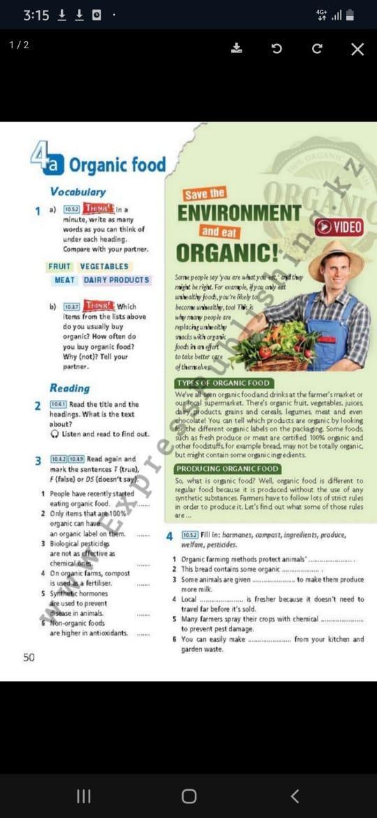 1.Organic farming methods protect animals' welfare. 2 This bread contains some organic ingredients. 3 Some animals are given hormones to make them produce more milk. 4 Local produce is fresher because it doesn't need totravel far before it's sold. 5 Many farmers spray their crops with chemical pesticides to prevent pest damage. 6 You can easily make compost from your kitchen andgarden waste.