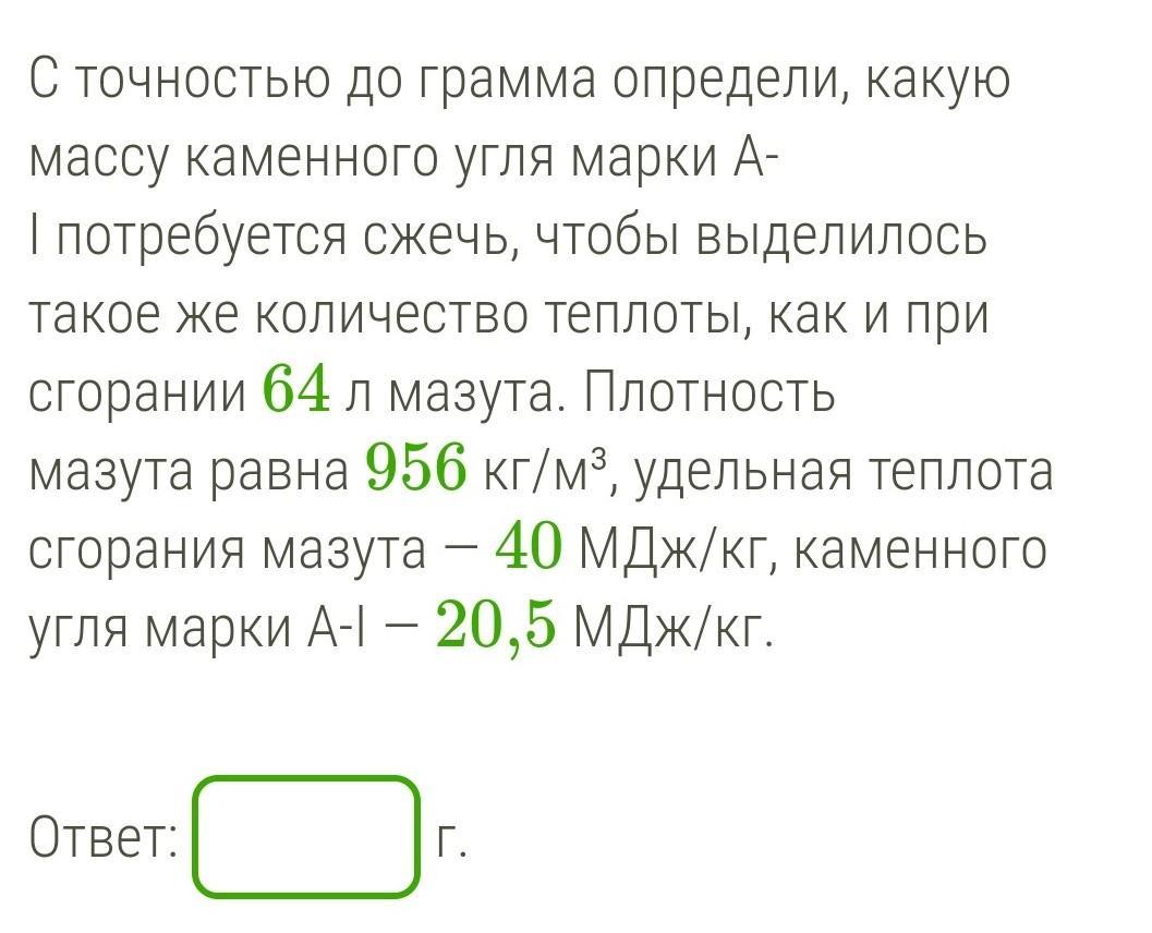 Теперь найдем массу каменного угля, которую надо сжечь, чтобы получить количество теплоты, как при сгорании 64л мазута