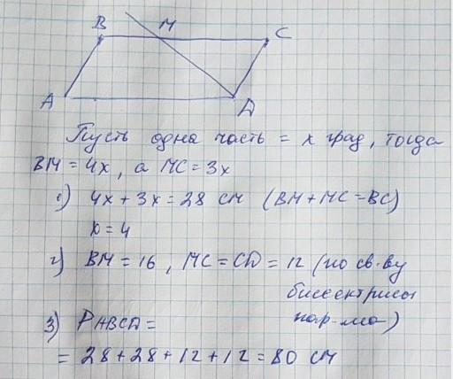 биссектриса угла D параллелограмма ABCD пересекает сторону BC в точке M, BM : C = 4:3 .Найдите периметр параллелограмма ,если BC равен 28 см