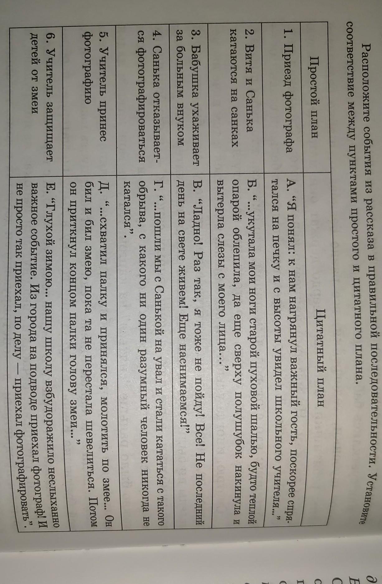 Расположите события из рассказа в правильной последовательности.Установите соответствие между пунктами простого и цитатного плана.