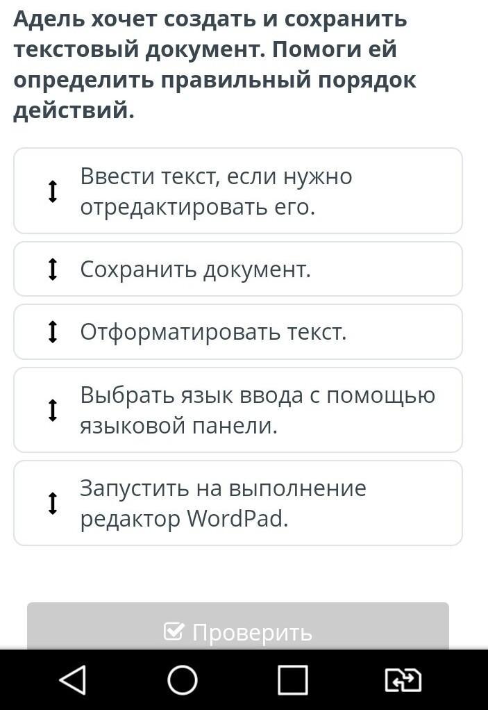 Адель хочет создать и сохранить текстовый документ. Помоги ей определить правильный порядок действий.