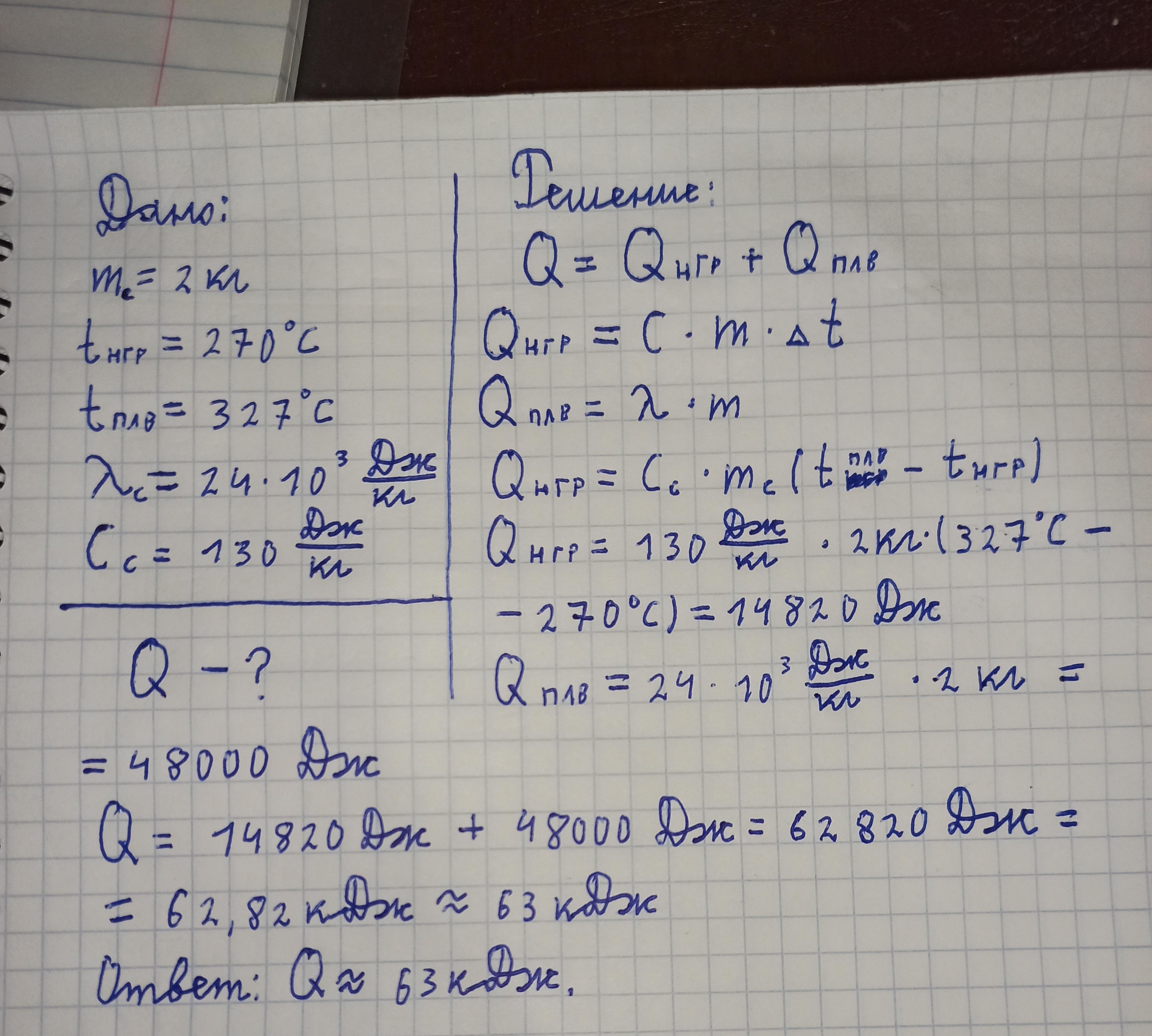 Какое количество теплоты надо передать свинцовому бруску массой 2 кг, взятому при температуре 270С, чтобы расплавить его?
