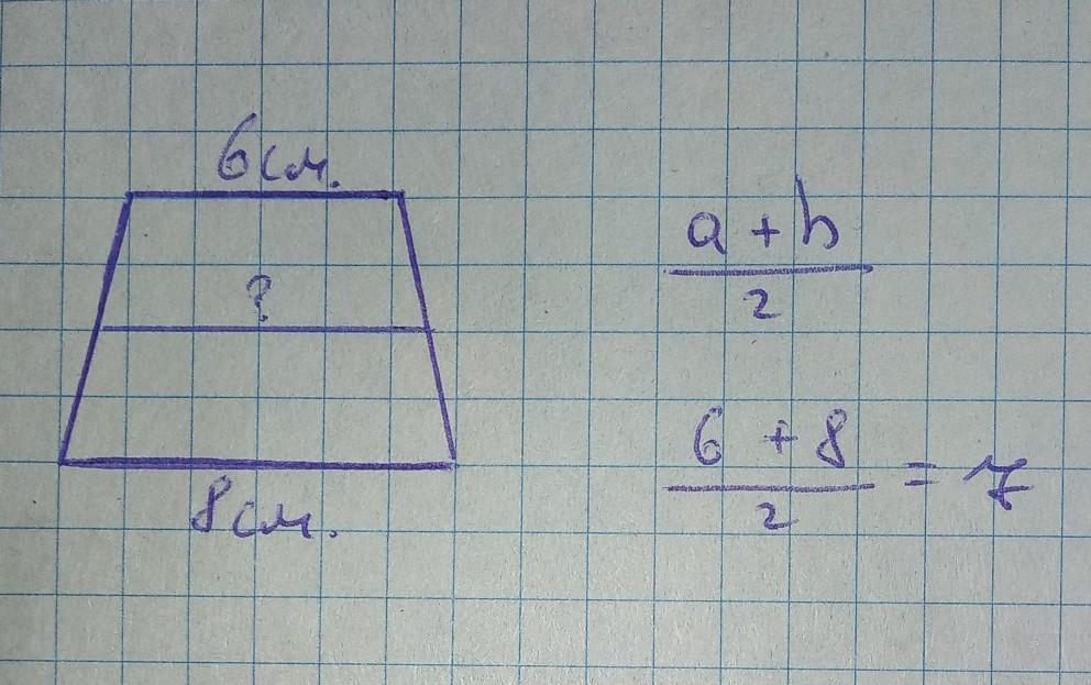 Нужно сложить основания 6+8=14 и поделить на 2. 14/2=7 ответ: 7