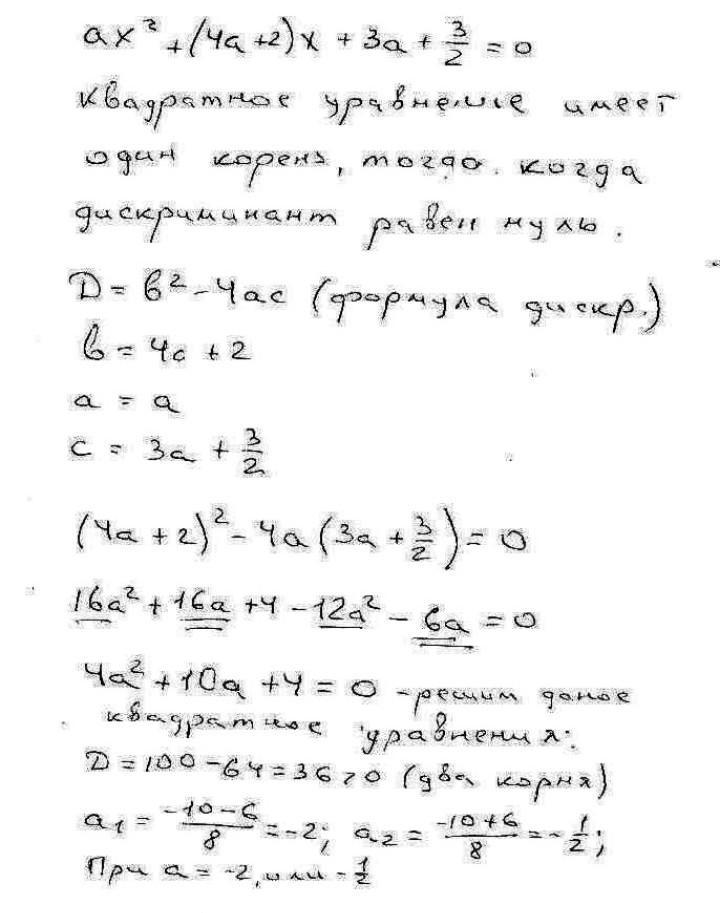 при каких значениях параметра a уравнение ax+(4a+2)x+3a+3/2=0 имеет единственное решение