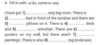 1)a, 2)a, 3)some, 4)a, 5)an, 6)some, 7)any, 8)a