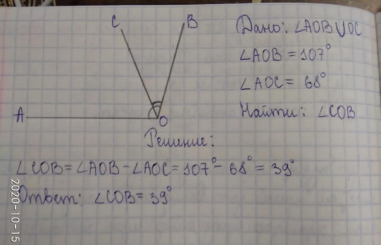 Угол АОВ лучом ОС разделен на две части, причем ∠АОВ=107° ∠АОС=68°