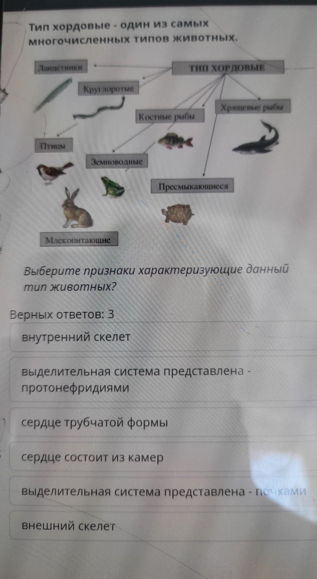 СРОЧНО ДАЮ МНОГО БАЛОВтип Хордовые один из самых многочисленных типов животных выберите признаки характеризующие данный тип животных верных ответов 3 внутренний скелет выделительная система представлена флигелями сердце трубчатой формы сердце состоит из камер выделительная система представлена почками внешний скелет