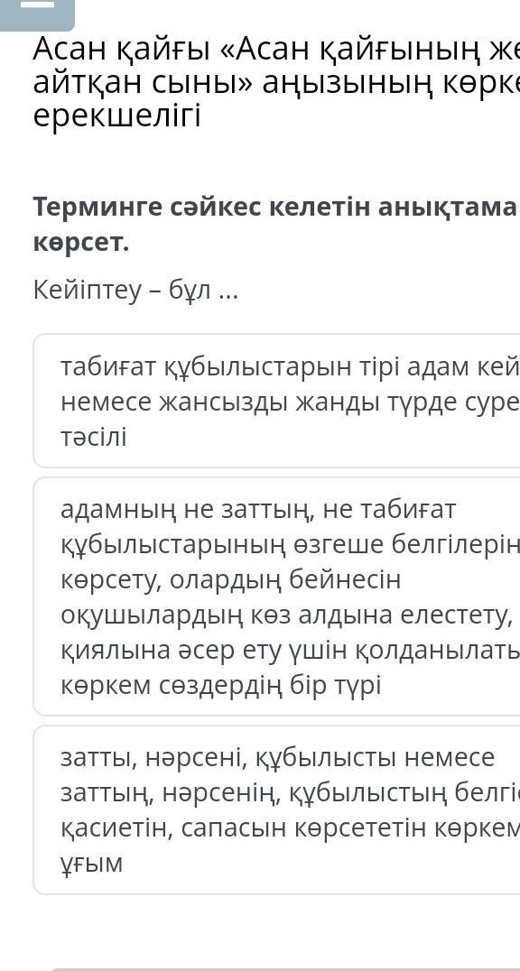 Кейіптеу– әр түрлі жануарларды, табиғат құбылыстарын немесе жансыз нәрселерді адам кейпіне келтіріп суреттейтін көркемдік тәсіл. Қазақ халқының бірқатар эпостық жырларындаатқа тіл бітіп, адамша ойлап, сезетіндей етіп бейнеленеді.
