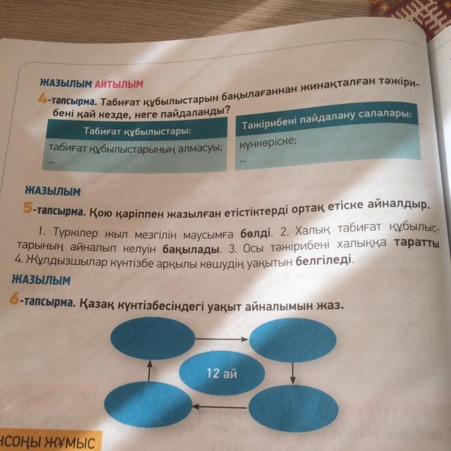 5-тапсырма . Қою қаріппен жазылған етістіктерді ортақ етіске айналдыр . 1. Туркілер жыл мезгілін маусымға бөлді . 2. Халық табиғат құбылыс арының айналып келуін бақылады . 3. Осы тәжірибені халыққа таратты . 4. Жұлдызшылар күнтізбе арқылы көшудің уақытын белгіледі . лық