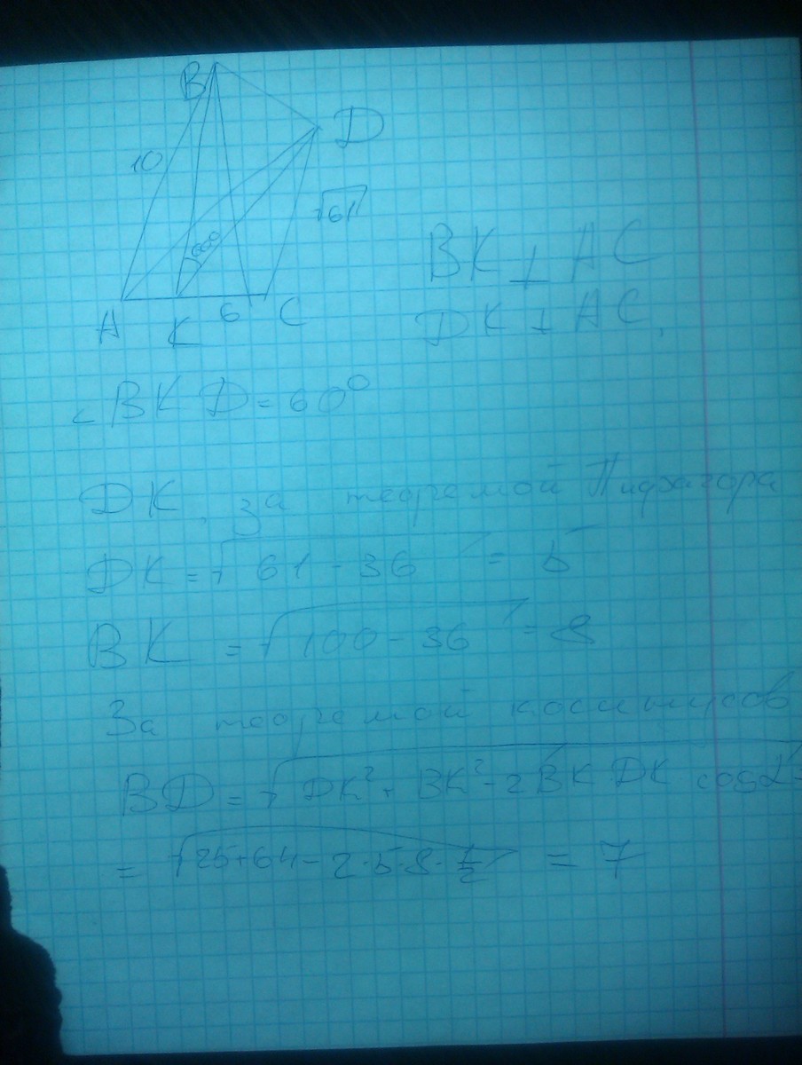 Боковые стороны равнобедренных треугольников ABC и ADC равны 10 и корень из 61 см, а их общее основание АС равно 12 см. Найдите угол BD, если двугривенный угол BACD равен 60*