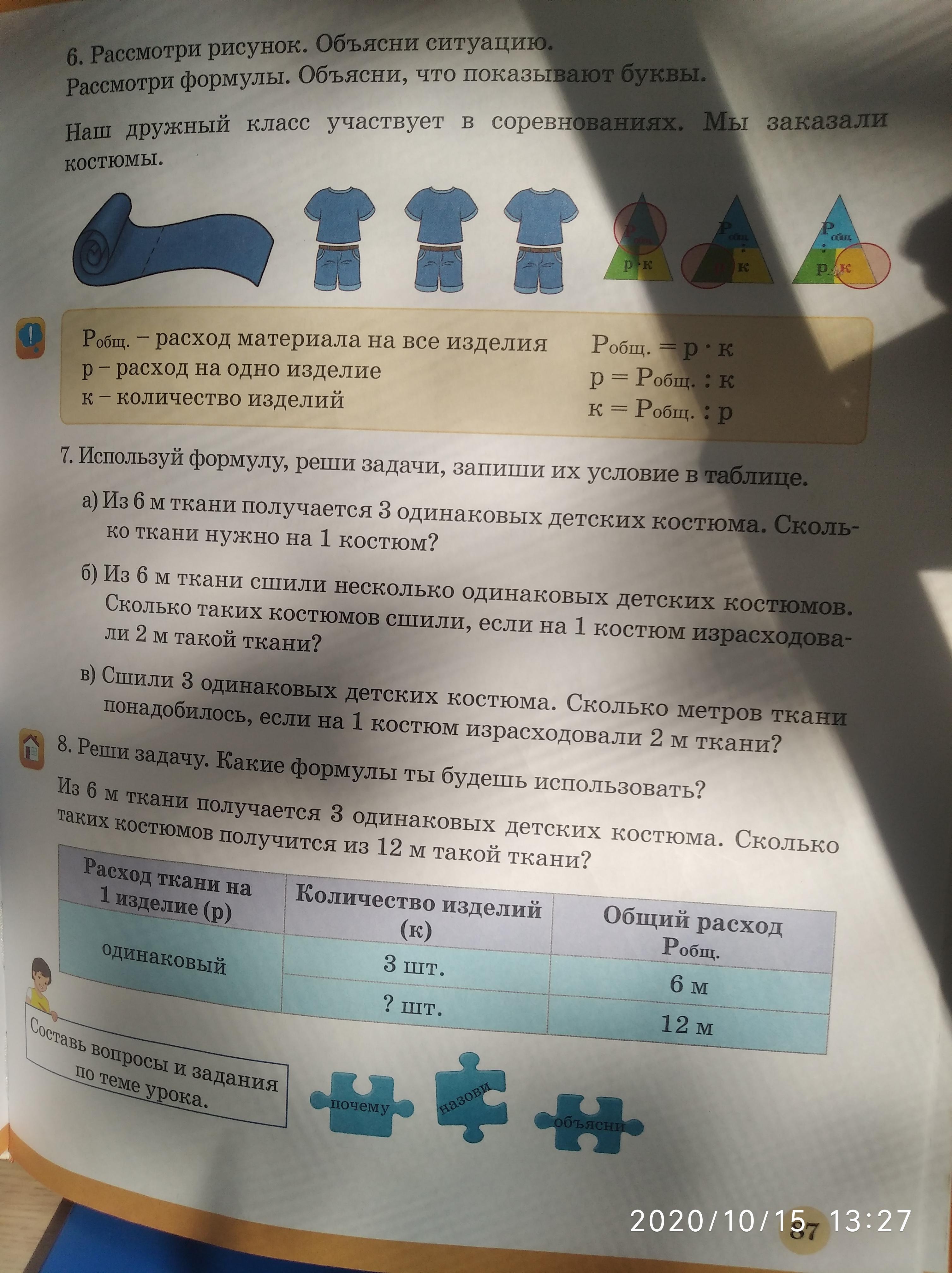если из 6 метров 3 костюма,то на каждый костюм уходит 6/3=2 метра ткани