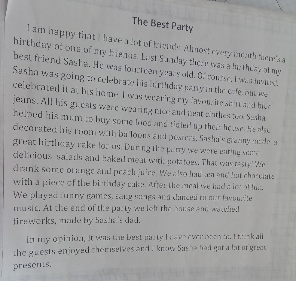 Я щасливий (щаслива) що маю багато друзів. Майже щомісяця у когось з моїх друзів день народження. Минулої неділі у мого найліпшого друга Саши був день народження. Йому виповнилося чотирнадцять років. Звичайно я був (була) запрошений(а). Саша планував відсвяткувати день народження в кафе, але ми святкували у нього вдома. Я одягнув (одягнула) свою улюблену футболку і блакитні джинси. Всі його гості були одягнені в гарний і акуратний одяг. Саша допоміг своїй мамі купити деяку їжу і прибрав вдома. Він також прикрасив свою кімнату повітряними кульками і плакатами. Бабуся Саши приготувала для нас чудовий святковий торт. Протягом вечірки ми їли смачні салати і запечене м'ясо з картоплею. це було смачно! ми пили апельсиновий і персиковий сік. Ми також пили чай і гарячий шоколад зі шматочком святкового торта. Після застілля нам було дуже весело. Ми грали в веселі ігри, співали пісні і танцювали під улюблену музику. В кінці вечірки ми вийшли з будинку подивитися на феєрверк який зробив тато Саши.