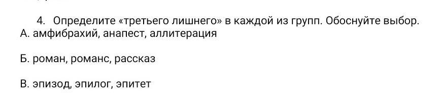 Эпизод, эпилог - части произведения. Эпитет - лишнее (сравнение)амфибрахий и анапест - трёхстопный размер стиха, аллитерация - лишнее (повторение одинаковых согласных)
