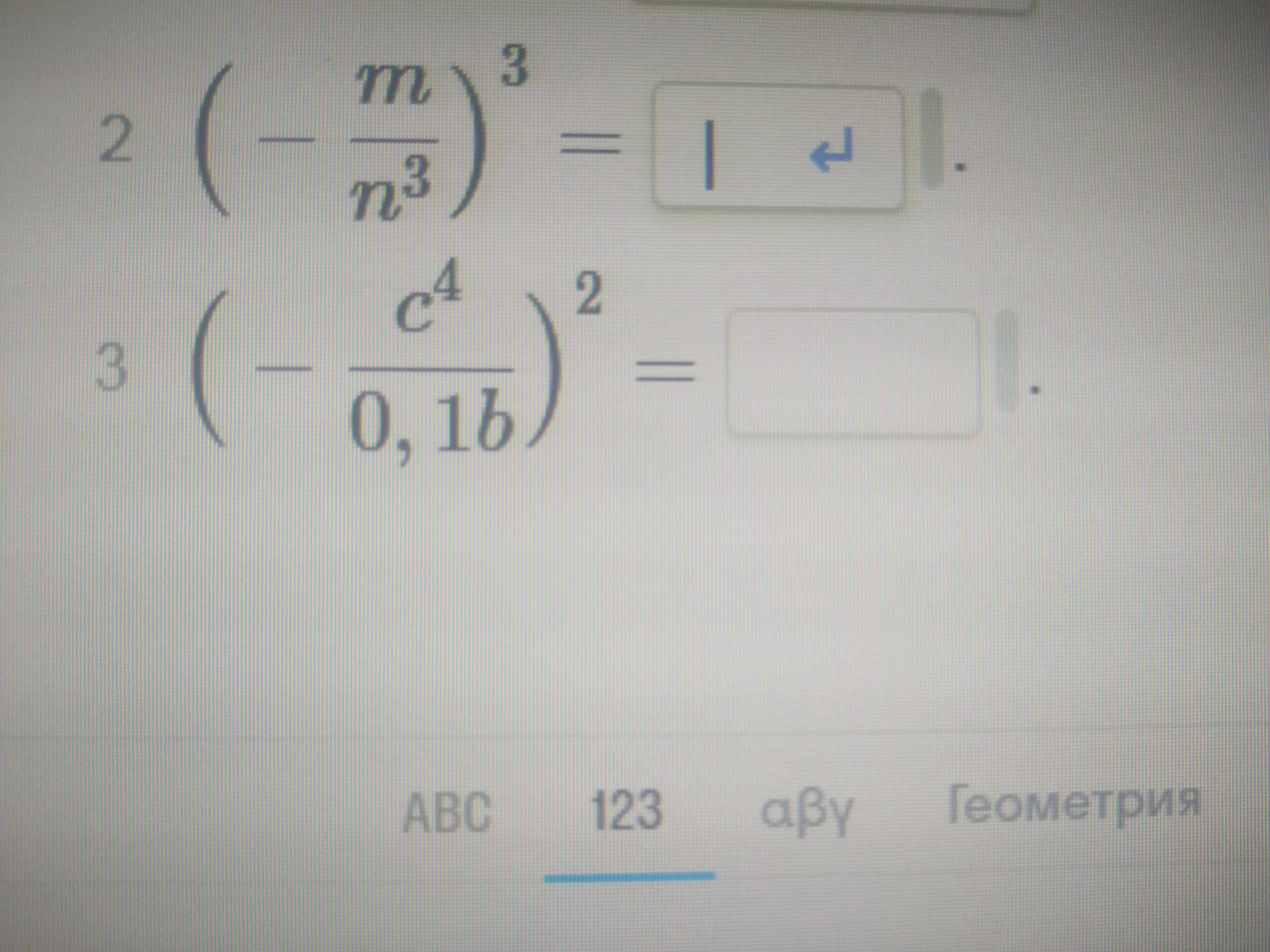 2)\;\;(-\frac{m}{n^3})^3=(-\frac{m^3}{n^9})\\\\3)\;\;(-\frac{c^4}{0.1b})^2=\frac{c^8}{0.01b^2}