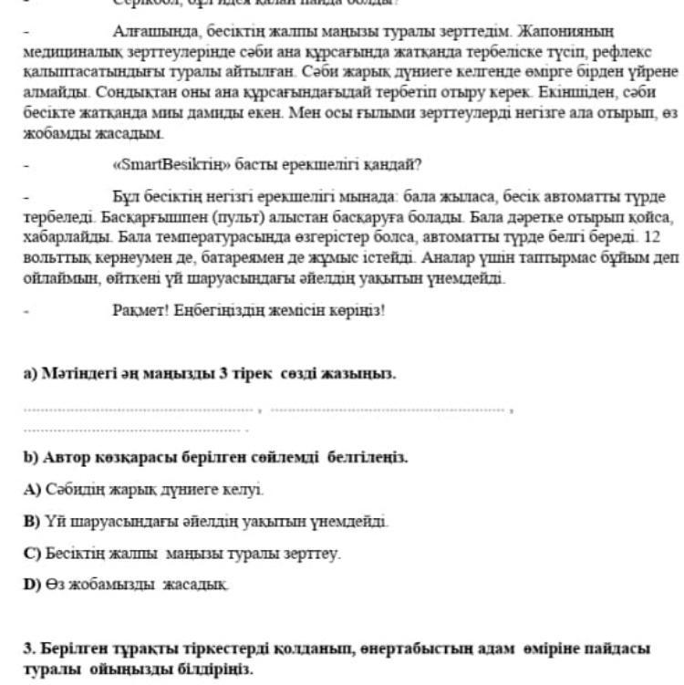 а) Мәтіндегі əң маңызды 3 тірек сөзді жазыңыз.