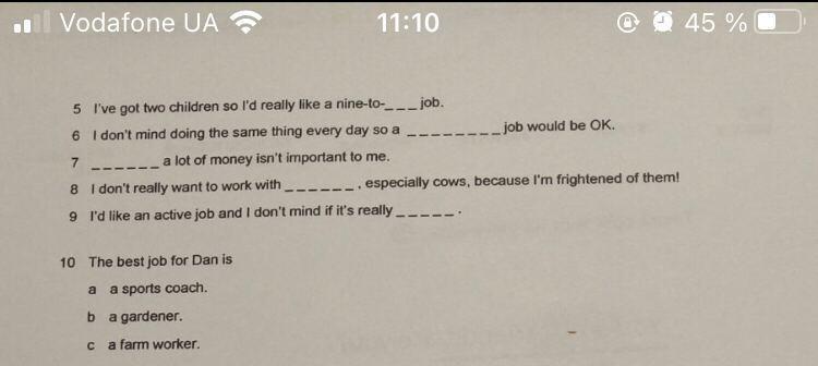 5) I've got two children so I'd really like a nine-to-five (с девяти до пяти) job.