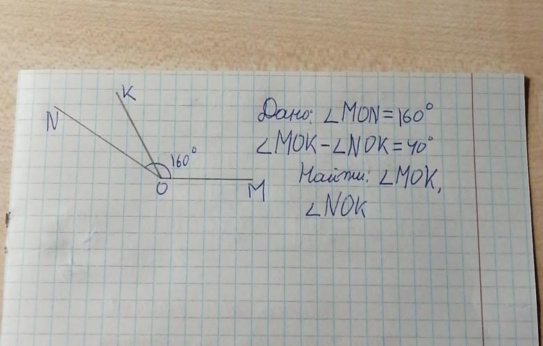 угол nok=x , угол mok=x+40 , угол mok + угол nok=160 , x+x+40=160 , 2x=160-40, x=120÷2, x=60—nok , mok= 60+40= 100