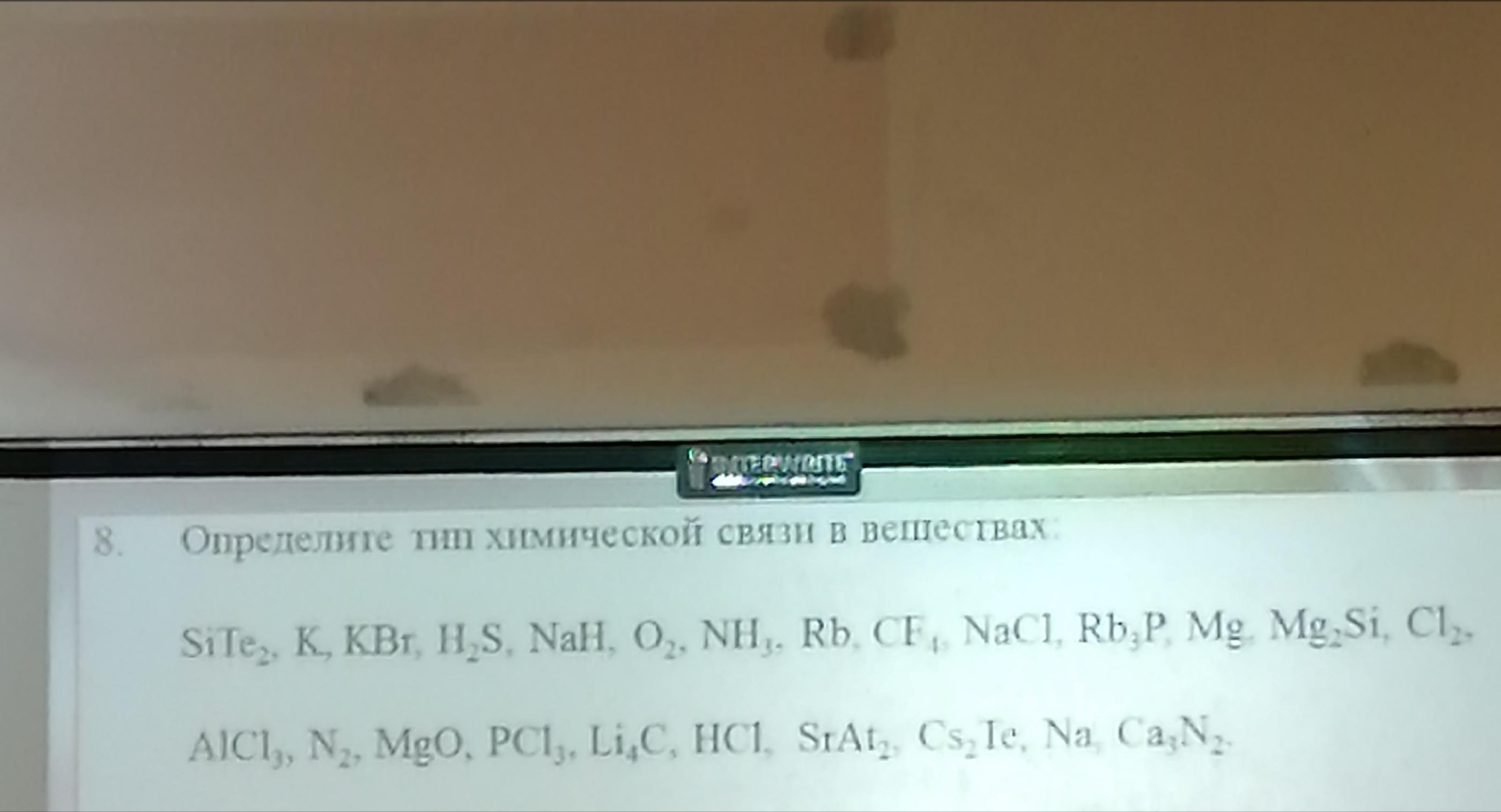 Ионная связь: KBr, NaH, NaCl, Rb3P, Mg2Si, AlCl3, MgO, Li4C, SrAt2, Cs2Te, Ca3N2