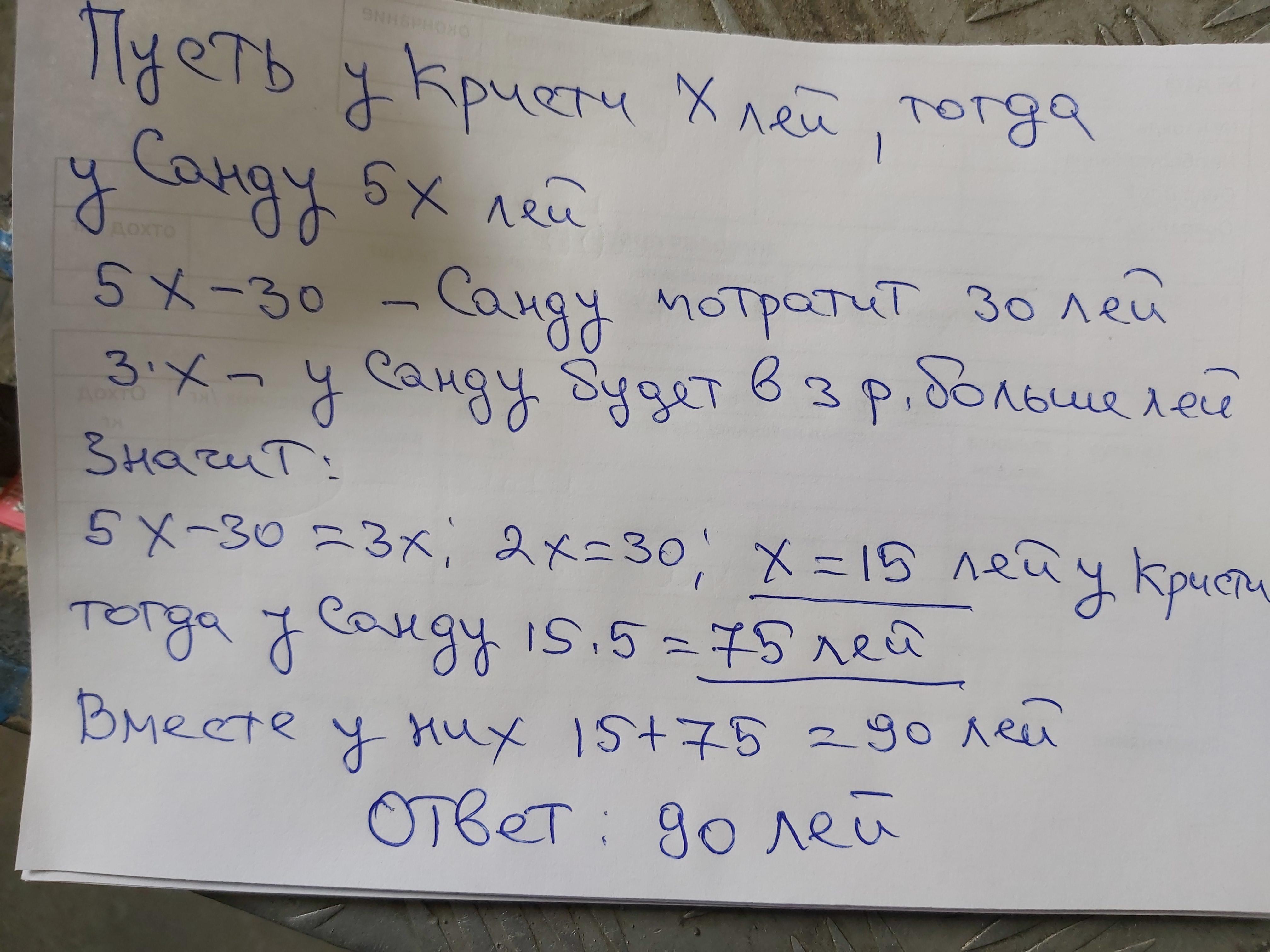 У Санду в 5 раз больше денег чем у Кристи.Если Санду потратит 30 лей то Санду будет иметь в 3 раза больше денег чем у Кристи.Сколько денег у обоих мальчиков вместе?
